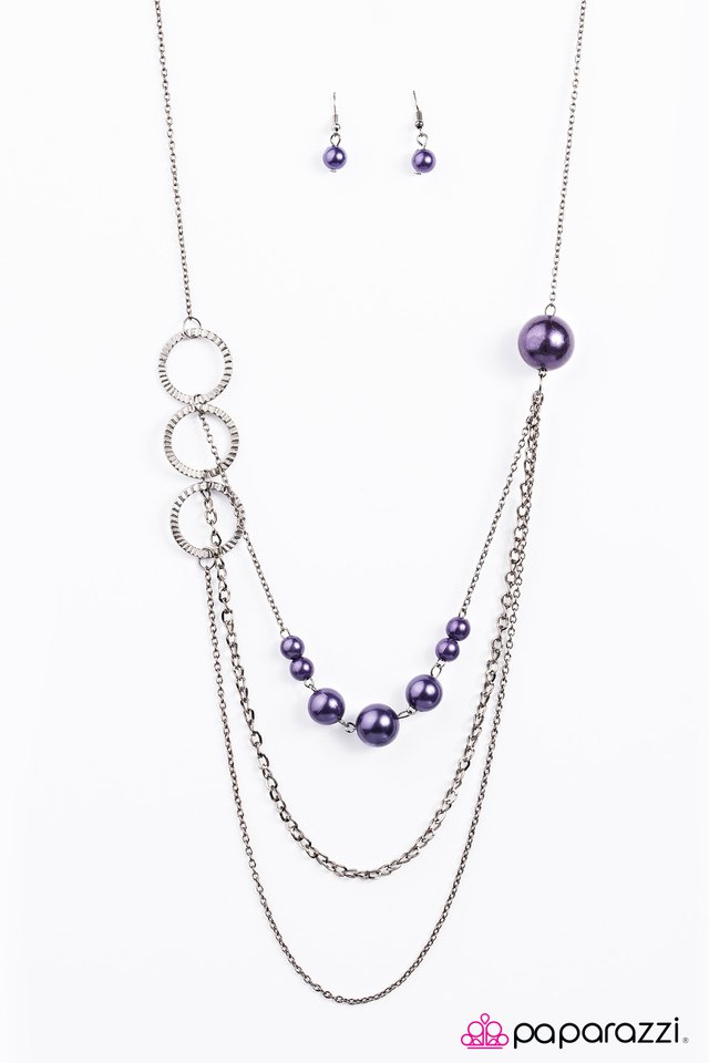 Crimped gunmetal rings offset a single purple bead with a pearly, metallic finish. A strand of matching beads drapes across the bottom of the design alongside two delicate gunmetal chains. Sold as one individual necklace. Includes one pair of matching earrings.
