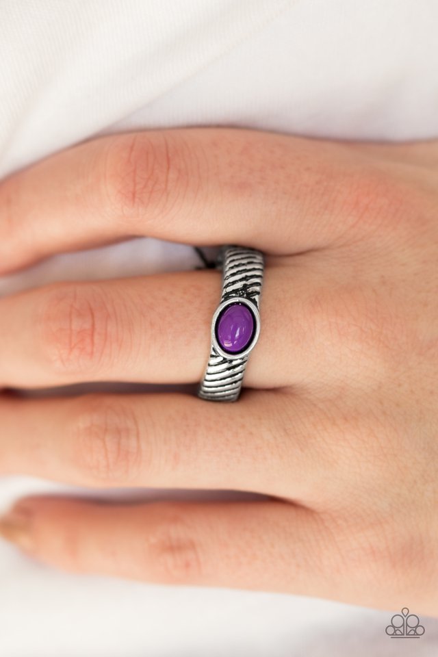 A vivacious purple bead is pressed into a dainty silver band radiating with striped texture for a seasonal look. Features a dainty stretchy band for a flexible fit. Sold as one individual ring.